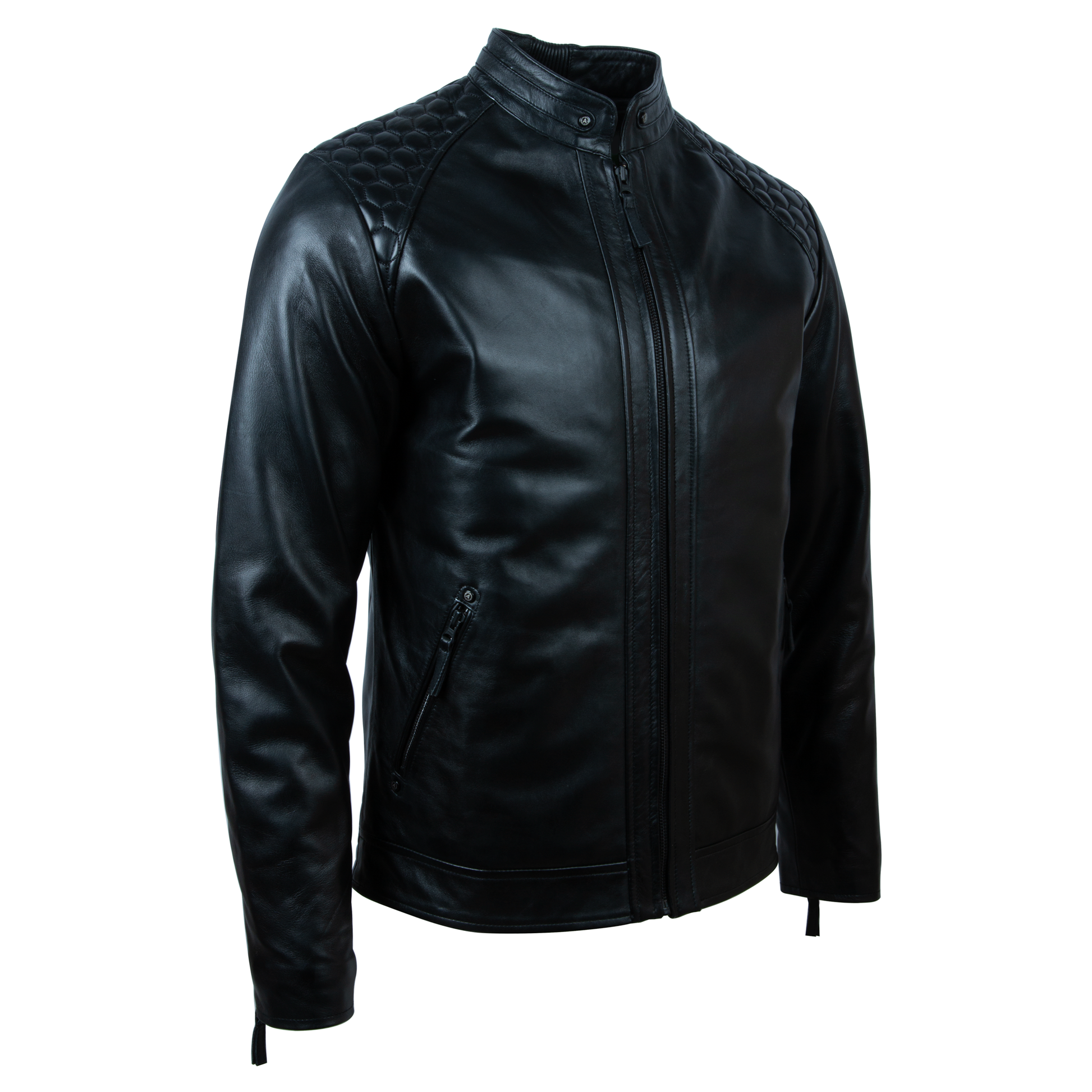 Stand out with this distinctive men's black hex honeycomb leather biker jacket from Aviatrix. Featuring unique hexagonal honeycomb quilting detail, this premium leather jacket combines modern design with classic biker styling for a bold, contemporary look.